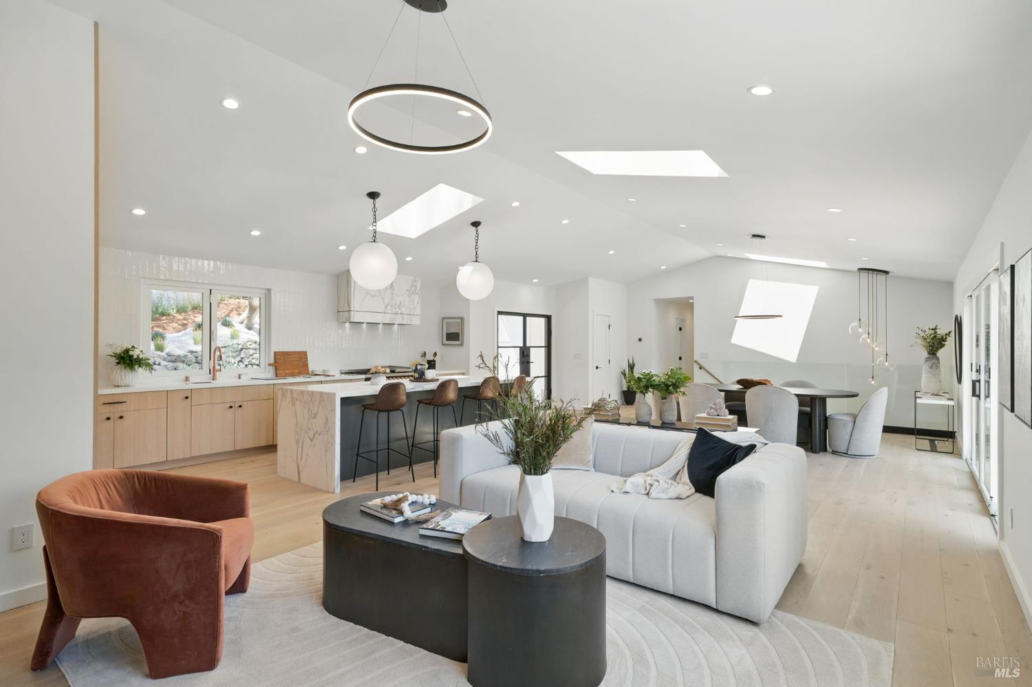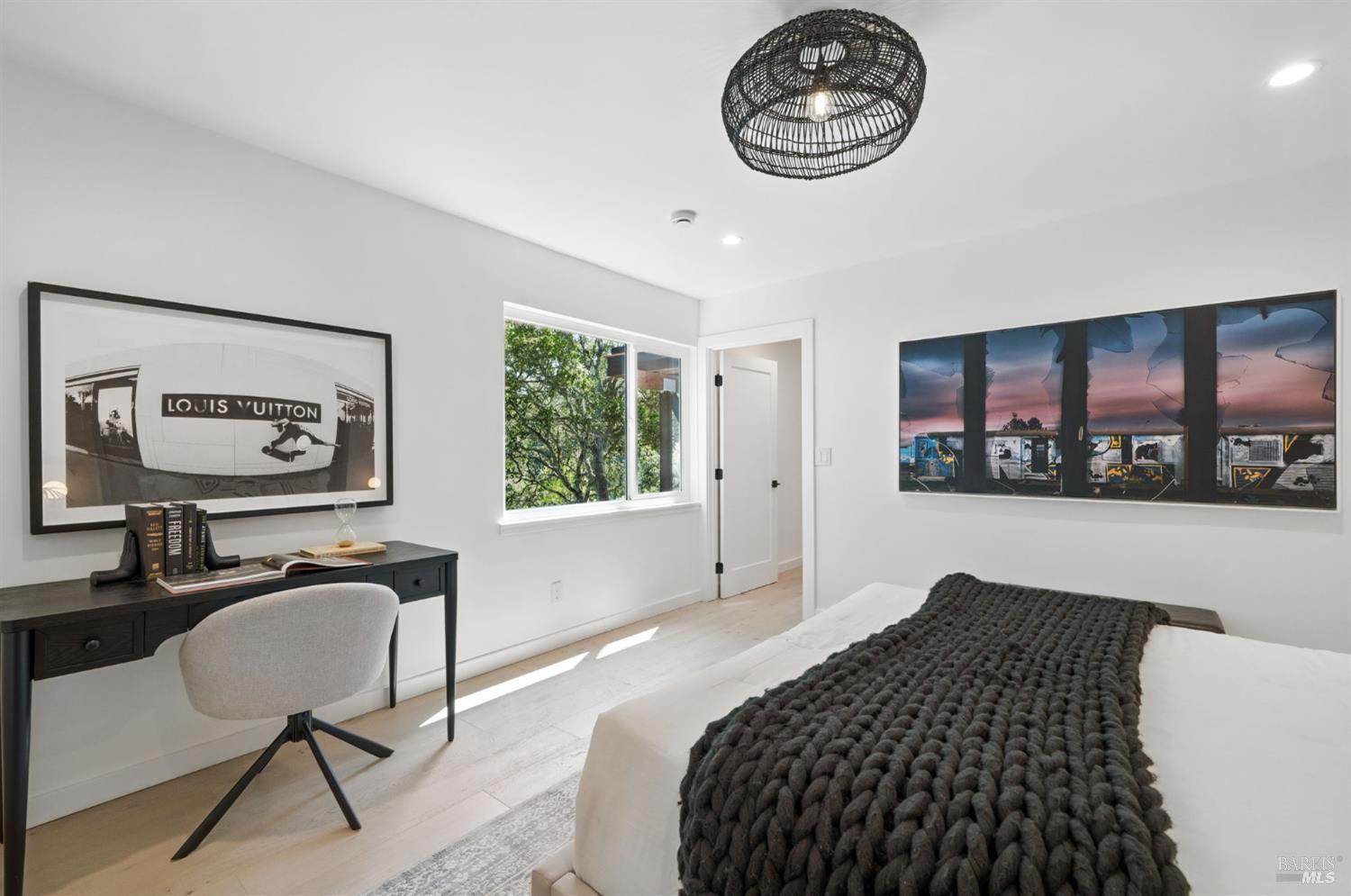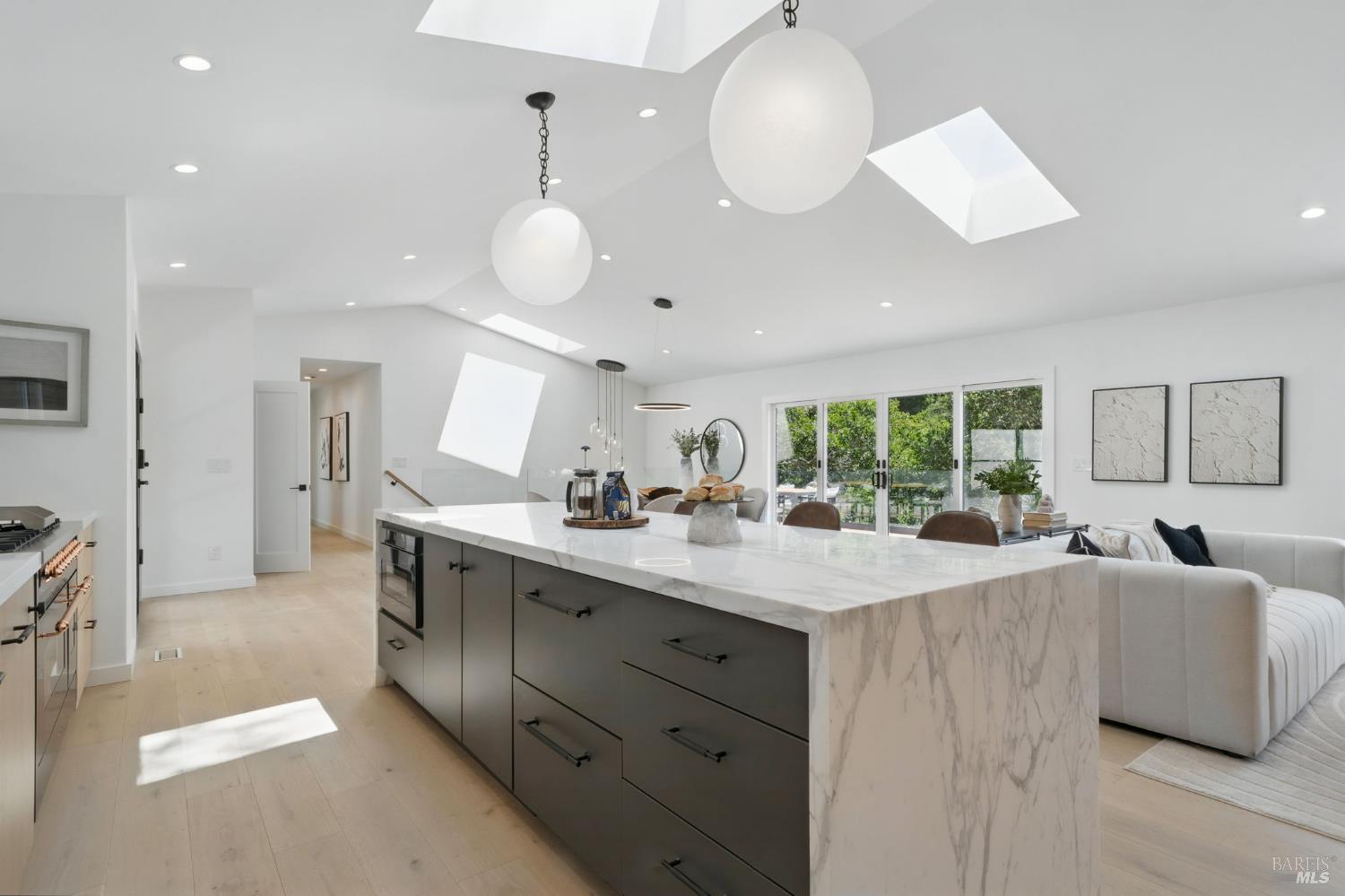 Experience luxury living at 21 Sheridan Court in Mill Valley's prestigious Country Club neighborhood. This reimagined 5-bedroom, 3-bathroom home spans 2,855 square feet, offering modern elegance and high design. The light-filled main living area and deck provide breathtaking views and seamless entertaining from the open living room and kitchen. The minimalist design features natural elements like terracotta, ceramics, marble, and wood. The chef's kitchen is equipped with premium appliances, an Ilve custom range, and a magnificent Calacatta Medici marble island. High-end finishes include lighting from Restoration Hardware, Anthropologie, and Room and Board. The primary suite and two bedrooms are on the main level, with two more bedrooms and a full bath downstairs. Located on a cul-de-sac, enjoy easy access to town with pathways. The deck is perfect for outdoor dining, and the yard offers access to a dog park and playground. Embrace a lifestyle of luxury, comfort, and convenience in this beautifully redeveloped home, perfect for modern living and entertaining.
